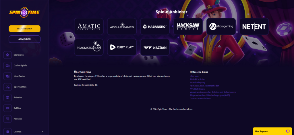 Das Spintime Casino ist ein Kryptocasino, was es für viele Spieler besonders interessant macht, aber andere gängige Zahlungsmethoden sind auch vorhanden. Zuletzt werden uns noch die neuesten Spiele vorgestellt, und dann sind wir bereits im Footerbereich, der uns die wichtigsten Informationen liefert: Die AGB, die Datenschutzbestimmungen, die KYC-Richtlinie und vieles mehr. Leider sind all diese Informationen ausschließlich auf Englisch verfügbar und auch nicht besonders übersichtlich aufbereitet – eine bessere optische Gliederung wäre sinnvoll.